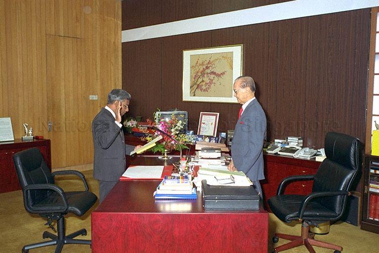 MINISTER FOR TRADE AND INDUSTRY S DHANABALAN TAKING OATH OF ALLEGIANCE WITNESSED BY PRESIDENT WEE KIM WEE AT SWEARING-IN CEREMONY HELD IN ISTANA
