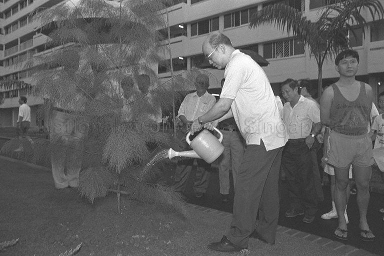 MEMBER OF PARLIAMENT FOR LENG KEE DR OW CHIN HOCK WATERING A SAPLING AT BLOCK 16, TELOK BLANGAH CRESCENT, ON TREE PLANTING DAY