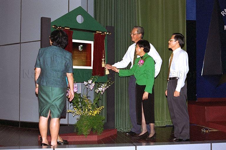 PRIME MINISTER GOH CHOK TONG UNVEILING COMMEMORATIVE PLAQUE AT OPENING OF THE RAFFLES GIRLS' SCHOOL (RGS) AT ANDERSON ROAD. ALSO ON STAGE ARE MINISTER FOR EDUCATION LEE YOCK SUAN AND RGS PRINCIPAL MRS CARMEE LIM (SECOND FROM RIGHT).