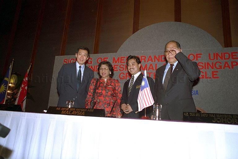 (FROM LEFT) DEPUTY PRIME MINISTER BRIGADIER-GENERAL LEE HSIEN LOONG, MALAYSIAN INTERNATIONAL TRADE AND INDUSTRY MINISTER DATUK SERI RAFIDAH AZIZ, MENTERI BESAR OF JOHOR TAN SRI MUHYIDDIN YASSIN AND INDONESIA'S COORDINATING MINISTER FOR TRADE AND INDUSTRY HARTARTO AT SIGNING OF MEMORANDUM OF UNDERSTANDING FOR INDONESIA-MALAYSIA-SINGAPORE GROWTH TRIANGLE (IMS-GT) HELD AT HYATT REGENCY, JOHOR BARU