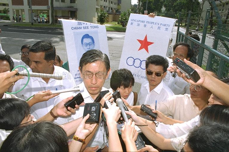NOMINATION DAY: ANG MO KIO/POTONG PASIR AT ANG MO KIO SECONDARY SCHOOL - PICTURE SHOWS SINGAPORE PEOPLE'S PARTY (SPP) CANDIDATE FOR POTONG PASIR CONSTITUENCY CHIAM SEE TONG SPEAKING TO REPORTERS