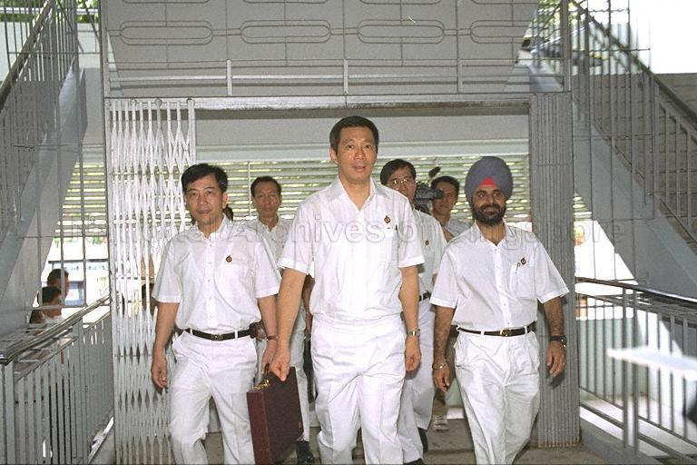 NOMINATION DAY: ANG MO KIO/POTONG PASIR AT ANG MO KIO SECONDARY SCHOOL - PICTURE SHOWS PEOPLE'S ACTION PARTY (PAP) CANDIDATES FOR ANG MO KIO GROUP REPRESENTATION CONSTITUENCY (GRC) TANG GUAN SENG, BRIGADIER-GENERAL (NS) LEE HSIEN LOONG, INDERJIT SINGH ARRIVING AT THE NOMINATION CENTRE WITH OFFICIALS
