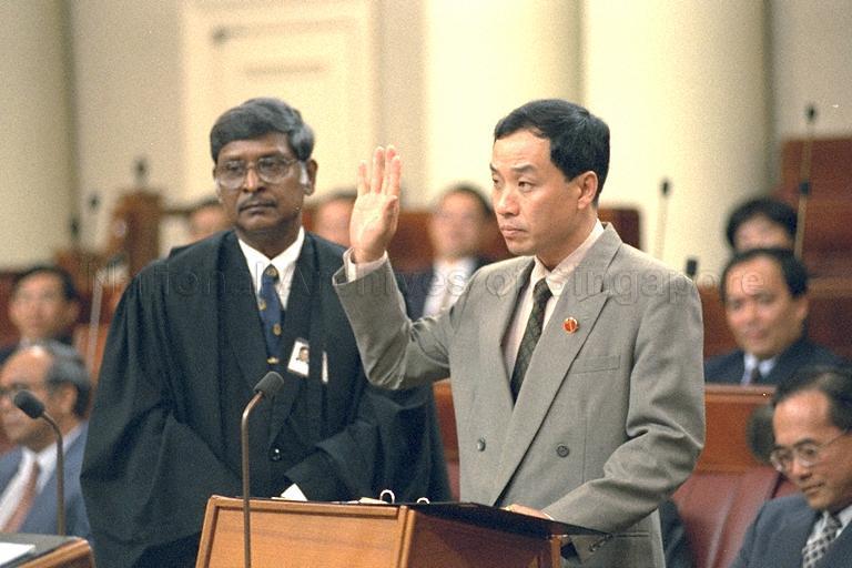WORKERS' PARTY (WP) MEMBER OF PARLIAMENT (MP) FOR HOUGANG LOW THIA KHIANG TAKING OATH AS MP AT SWEARING-IN CEREMONY DURING FIRST SESSION OF NINTH PARLIAMENT AT PARLIAMENT HOUSE