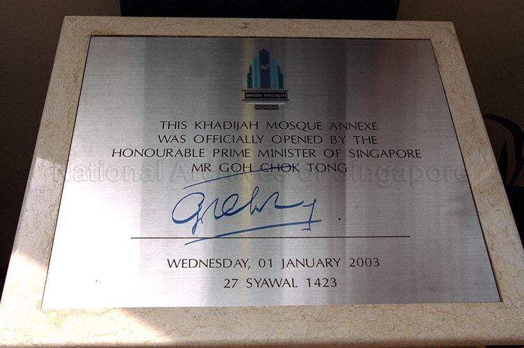 Plaque commemorating Official Opening of Khadijah Mosque Annexe by Prime Minister Goh Chok Tong