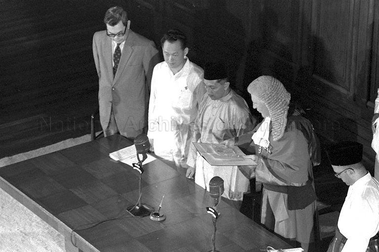 Installation of first Malayan-born Yang Di-Pertuan Negara Yusof bin Ishak in the presence of Chief Justice Sir Alan Rose witnessed by Prime Minister Lee Kuan Yew and Speaker of Legislative Assembly Sir George Oehlers and State Advocate-General Ahmad Ibrahim (right) at City Hall Chambers