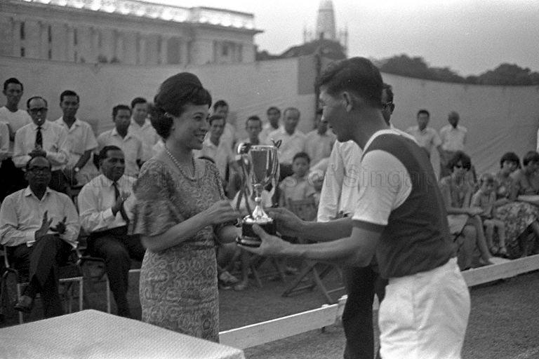 MRS GLORIA BARKER, WIFE OF MINISTER FOR LAW AND NATIONAL DEVELOPMENT E W BARKER, PRESENTS TROPHY DURING ANNUAL POPPY DAY HOCKEY MATCH BETWEEN SINGAPORE CIVILIANS AND JOINT SERVICES AT THE PADANG
