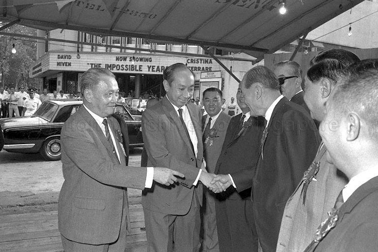 MINISTER OF FINANCE DR GOH KENG SWEE BEING GREETED ON ARRIVAL FOR FOUNDATION STONE LAYING CEREMONY OF OVERSEAS UNION BUILDING AND MANDARIN HOTEL AT ORCHARD ROAD