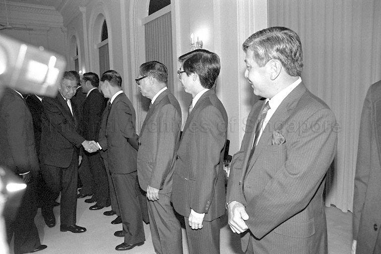 BURMESE PRIME MINISTER U MAUNG MAUNG KHA GREETING CABINET MINISTERS AND GUESTS DURING A DINNER HOSTED BY PRIME MINISTER LEE KUAN YEW AT THE ISTANA