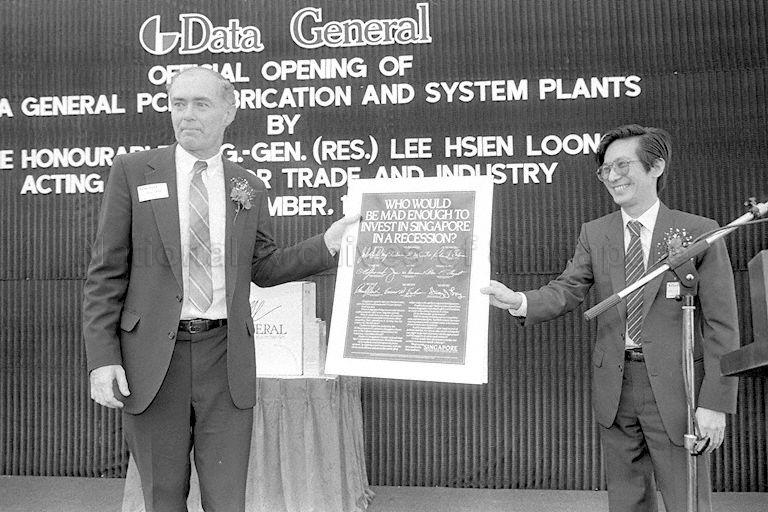 ECONOMIC DEVELOPMENT BOARD (EDB) CHAIRMAN PHILIP YEO AT OFFICIAL OPENING OF COMPUTER SYSTEMS AND PRINTED CIRCUIT BOARD (PCB) PLANTS OF DATA GENERAL MANUFACTURING LTD AT 149A GUL CIRCLE IN JURONG