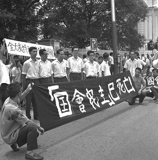 FORMER BARISAN SOSIALIS MEMBER OF PARLIAMENT CHIA THYE POH AND SUPPORTERS WITH BANNERS PROCLAIMING THE DEATH OF DEMOCRACY IN PARLIAMENT