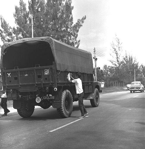 YOUNG BARISAN SOSIALIS AGITATOR STICKING CYCLOSTYLED POSTER ON A TRUCK OUTSIDE SINGAPORE CHANGI PRISON