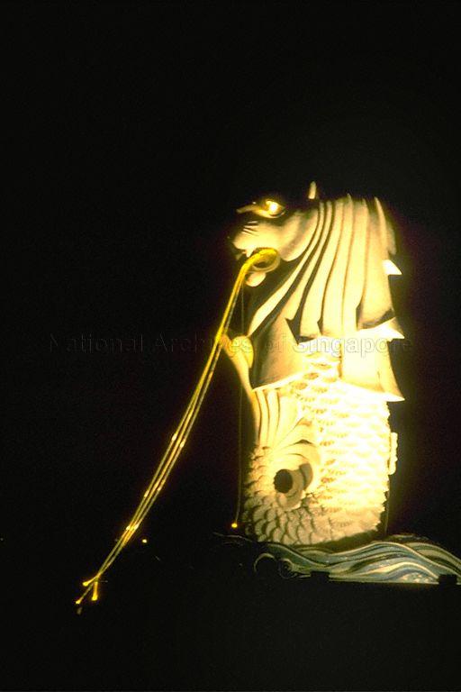 A NIGHT SCENE OF THE MERLION STATUE WITH LIGHTS-SIMULATED WATER-SPRAY FROM ITS MOUTH AT THE MERLION PARK