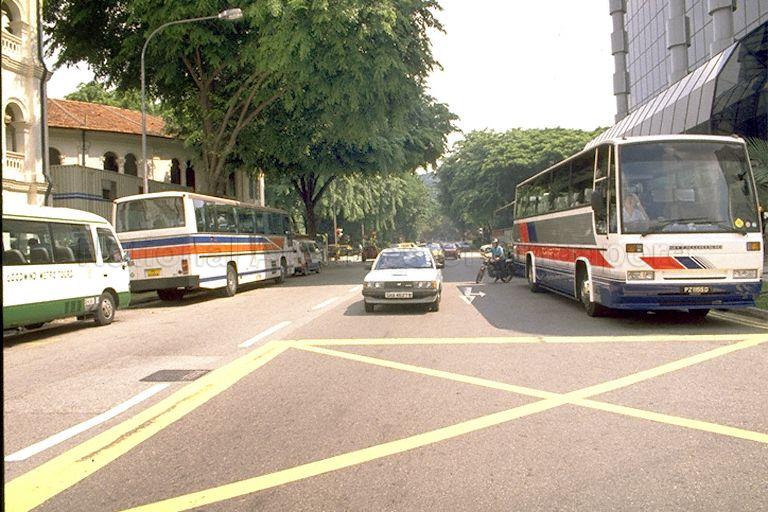 COACHES PARKED OUTSIDE PLAZA BY THE PARK AT WATERLOO STREET (EARLY 1990S)