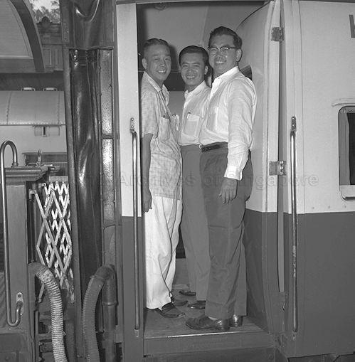 DR LEE SIEW CHOH, MR LIM CHIN SIONG AND MR STEPHEN K T YONG, BARISAN SOSIALIS DELEGATION TO MALAYSIAN SOSIALIS CONFERENCE ON MALAYSIA PLAN IN KUALA LUMPUR, AT SINGAPORE RAILWAY STATION