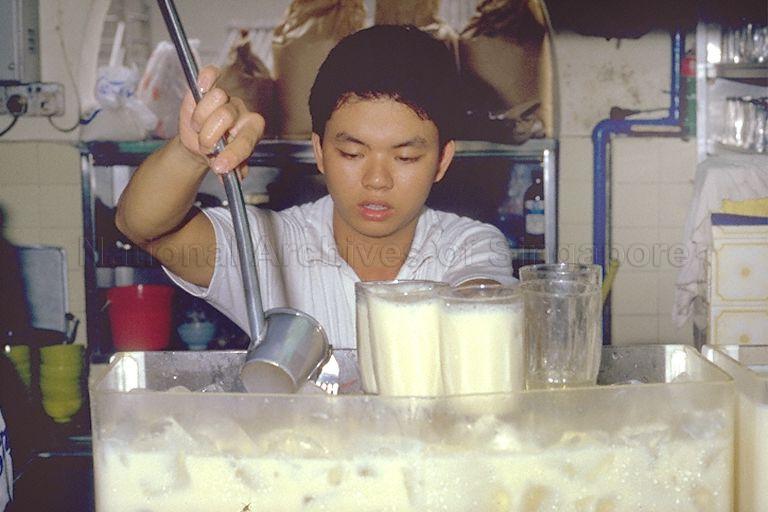 A HAWKER PREPARING DRINKS AT HIS SOYA BEAN DRINKS STALL (C.1980S)