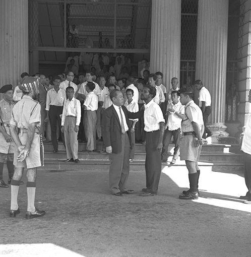 CHIEF DEFENCE COUNSEL MR TANN WEE TIONG CALMING A BEARDED BARISAN SOSIALIS SUPPORTER, WHO CHALLENGES POLICE GUARDS TO ARREST HIM, DOWN