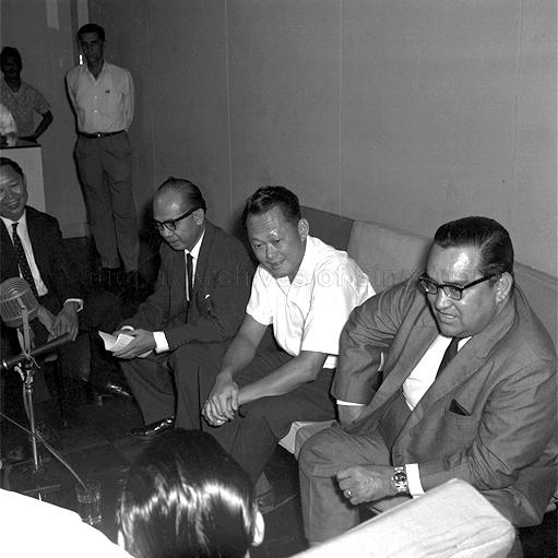 MEETING THE PRESS ON SINGAPORE-MALAYSIA MERGER AT SINGAPORE PAYA LEBAR AIRPORT - (FROM LEFT) SARAWAK CHIEF MINISTER STEPHEN NINGKANG, PRIME MINISTER LEE KUAN YEW AND SABAH CHIEF MINISTER-DESIGNATE DONALD STEPHENS
