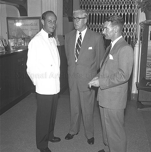 MANAGER FRANZ SCHUTZMAN CHATTING WITH MR H R BROWN, MANAGER OF TRAVEL DEPARTMENT OF BANK OF NEW SOUTH WALES, SYDNEY, AND MR T H KELLOCK OF BANK OF NEW SOUTH WALES, MELBOURNE, IN A HOTEL LOBBY