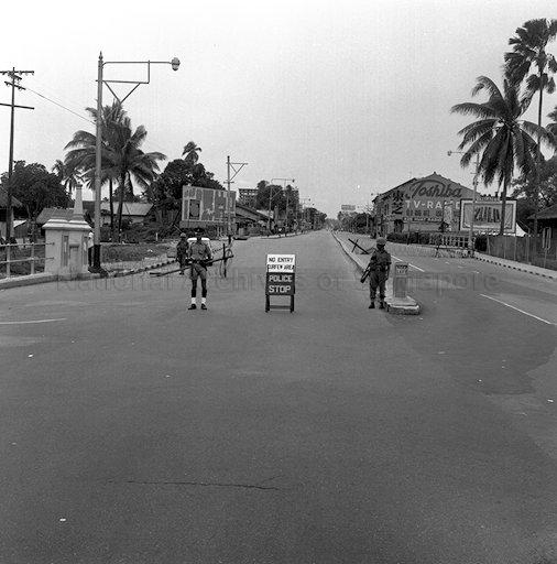 REIMPOSING OF CURFEW IN JOO CHIAT/GEYLANG AREAS [CONFRONTATION] - ROAD BLOCK AT JUNCTION OF PAYA LEBAR/GEYLANG ROADS INDICATES BEGINNING OF CURFEW AREA WHERE MILITARY AND POLICE VEHICLES PATROL THE STRETCH AT SHORT INTERVALS