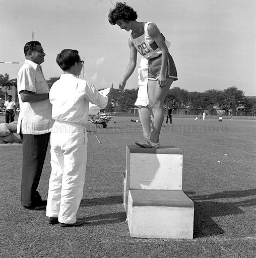 DEPUTY PRIME MINISTER DR TOH CHIN CHYE PRESENTS THE AWARD TO THE WINNER AT THE NATIONAL DAY TRIANGULAR ATHLETICS MEET OPENED AT THE FARRER PARK STADIUM.