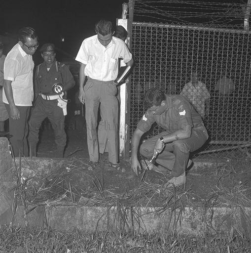 MYSTERIOUS EXPLOSION AT DEPOT OF HOCK LEE BUS COMPANY IN ALEXANDRA ROAD [CONFRONTATION] - ARMY BOMB EXPERT EXAMINING SITE OF EXPLOSION