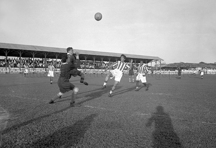 AWANG BAKAR, W VAN HUIZEN AND R MOSBERGEN DURING SOCCER MATCH BETWEEN MALAYS AND EUROPEANS AT JALAN BESAR STADIUM