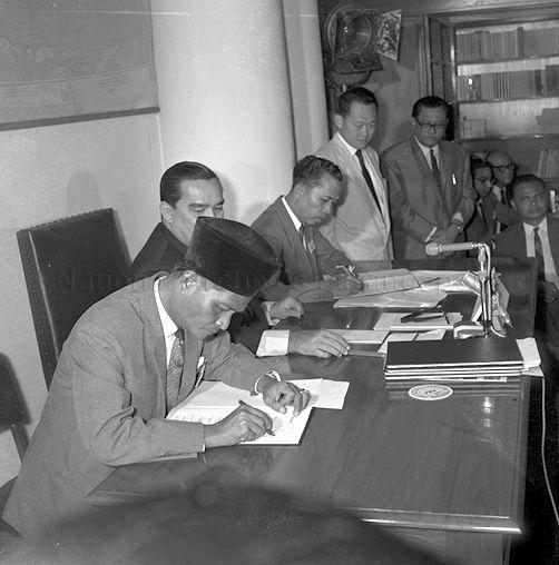 CHAIRMAN OF MALAYSIA SOLIDARITY CONSULTATIVE COMMITTEE DONALD STEPHENS (2ND LEFT) WITNESSING THE SIGNING OF THE "MEMORANDUM ON MALAYSIA" BLUEPRINT BY LEADERS OF BORNEO AND BRUNEI DELEGATIONS, DATO MUSTAPHA BIN DATO HARUN AND DATO ALI BIN HAJI DAUD AT LBRARY OF SINGAPORE ASSEMBLY HOUSE