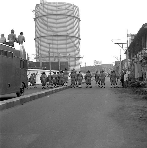 RACIAL RIOTS 1964 - RIOT SQUADS AND FEDERAL RESERVE UNIT POLICE AT KALLANG ROAD NEAR THE GASWORKS