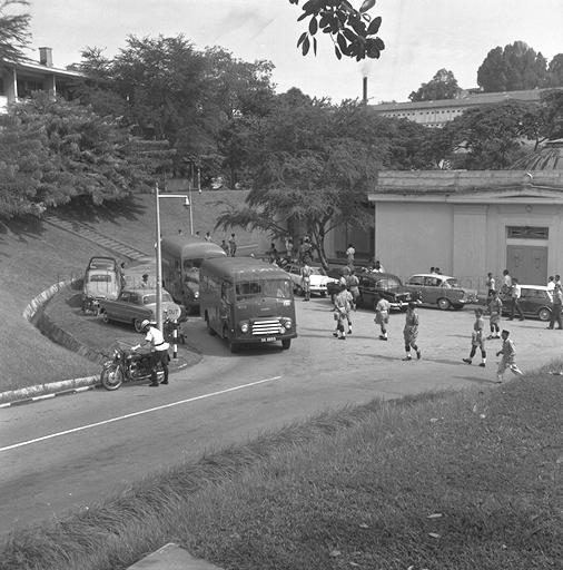 PULAU SENANG RIOT - BLACK MARIA WITH BODIES OF THE HANGED DETAINEES ARRIVING AT MORTUARY (WHITE BUILDING ON RIGHT) OF SINGAPORE GENERAL HOSPITAL
