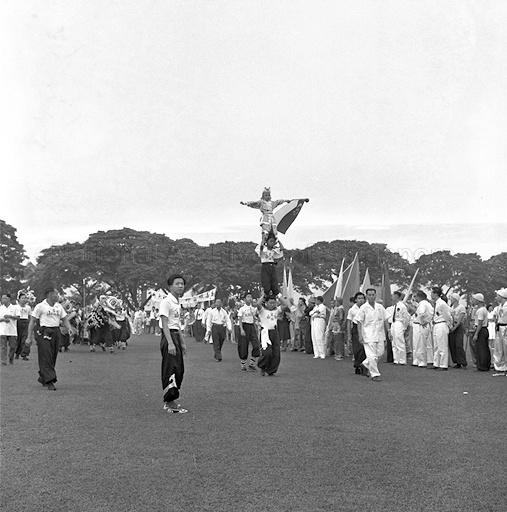 LITTLE ACROBAT FLASHING THE NATIONAL FLAG DURING HIS PERFORMANCE ON NATIONAL DAY