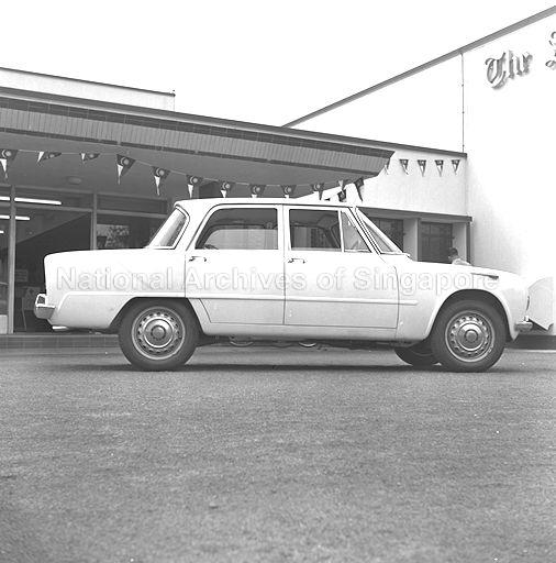 [THE ALFA ROMEO GIULIA 1600 TI IS THE LATEST FOUR-DOOR SALOON FROM ITALY. THE SALOON DOES NOT COME WITH A WING-MIRROR, BUT THE USUAL DRIVING MIRROR IS AN IMPROVEMENT. THE GIULIA 1600 IS POWERFUL AND FAST, AND HAS EXCEPTIONAL HANDLING QUALITIES. ITS COMPACT OVERALL, DIMENSIONS, HIGH POWER OUTPUT AND RESPONSIVE CONTROLS MAKE IT EASILY MANOEUVRABLE IN TRAFFIC. PRICE: $9,750.] THE ALFA ROMEO GIULIA 1600 TI