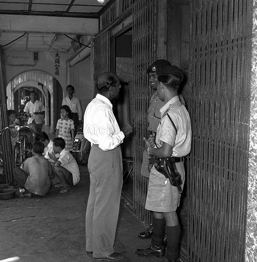 MR T T RAJAH (LEFT), LEGAL ADVISOR AND MEMBER OF BARISAN SOSIALIS, TALKING TO POLICEMEN AT SINGAPORE ASSOCIATION OF TRADE UNION (SATU) HEADQUARTERS IN MIDDLE ROAD