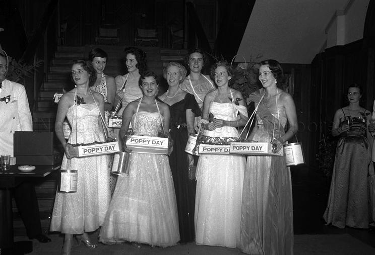 (FRONT FROM LEFT) A KNIGHT, MURIEL DAY, S BARTON, TONI HARDING, JOCELYN RUSHWORTH, ANN GILMOUR, MRS W H DAY (CENTRE) AND MISS A BAUGHAN VOLUNTEER TO SELL POPPIES AT POPPY DAY BALL IN FLAGSTAFF HOUSE