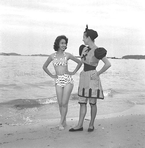 [BEACH FASHION AT EAST COAST, SINGAPORE] MARION WILLIS (IN BIKINI) AND JOAN BOOTY.