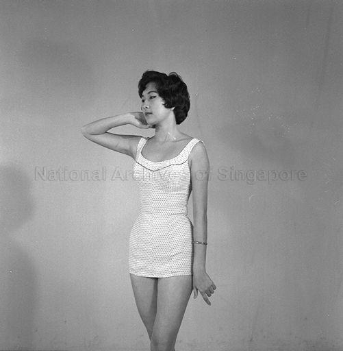 [SWIMSUITS FASHION IN THE STRAITS TIMES STUDIO, SINGAPORE. THIS BEAUTIFULLY CUT COSTUME "BISCAY" LOOKS WONDERFUL ON JUDY. NOTE THE DINKY SKIRT, LOW CUT BACK AND THE "FAGOTTED" BAND.] THIS BEAUTIFULLY CUT COSTUME "BISCAY" LOOKS WONDERFUL ON JUDY. NOTE THE DINKY SKIRT, LOW CUT BACK AND THE "FAGOTTED" BAND.