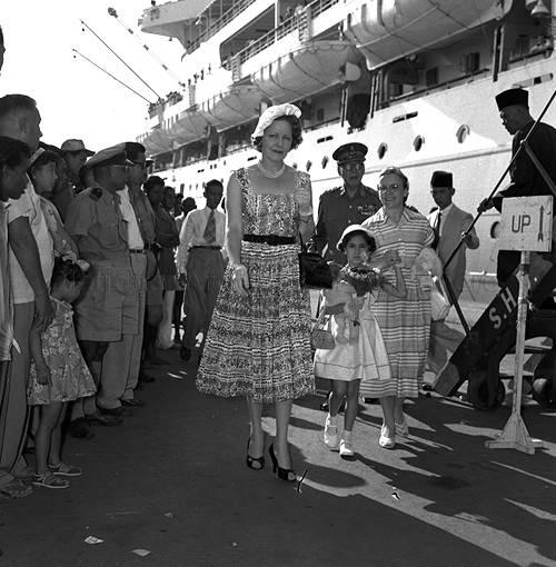 SULTAN OF JOHORE AND LADY IBRAHIM WITH PRINCESS MARIAM OF JOHORE AND HER NURSE, MISS ELIZABETH BERLINGER, DISEMBARKING "WILLIAM RUYS"