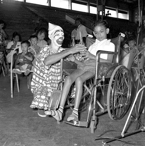 NSOY [ARMY CLOWNS, LOCAL COMEDIANS AND SINGERS BROUGHT JOY TO SOME 550 HANDICAPPED CHILDREN AT A MALAYSIA PARTY AT THE BADMINTON HALL. THE PARTY WAS ORGANISED BY THE ROTARY CLUB AND THE CHILDREN WERE FROM A NUMBER OF HOMES INCLUDING THE ST. ANDREW'S ORTHOPAEDIC HOSPITAL.] PICTURE SHOWS A CLOWN BRINGING A DRINK AND JOY TO A BOY FROM THE RED CROSS HOME, AS HE SITS IN HIS WHEEL-CHAIR.