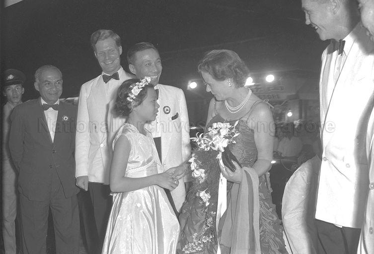[LADY GOODE, WIFE OF THE GOVERNOR, SIR WILLIAM GOODE, RECEIVES A BOUQUET FROM LITTLE GENEVIEVE CHOK, DAUGHTER OF MR TONY CHOK, MANAGER OF UNITED ARTISTS IN SINGAPORE, AT LAST NIGHT'S OPENING OF THE SKY THEATRE. LOOKING (FROM LEFT) THE GOVERNOR'S A.D.C. MR RUN RUN SHAW AND SIR WILLIAM.] EXTRACT FR TEXT: [LADY GOODE, WIFE OF THE GOVERNOR, SIR WILLIAM GOODE, RECEIVES A BOUQUET FROM LITTLE GENEVIEVE CHOK, DAUGHTER OF MR TONY CHOK, MANAGER OF UNITED ARTISTS IN SINGAPORE, AT LAST NIGHT'S OPENING OF THE SKY THEATRE. LOOKING (FROM LEFT) THE GOVERNOR'S A.D.C. MR RUN RUN SHAW AND SIR WILLIAM.]