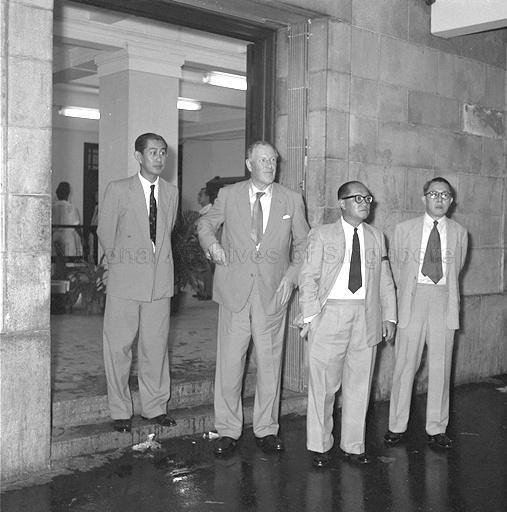 SINGAPORE CHIEF JUSTICE SIR ALAN ROSE (SECOND FROM LEFT) WITH HIS BROTHER JUDGES (FROM LEFT) MR JUSTICE WEE CHONG JIN, MR JUSTICE F A CHUA AND MR JUSTICE TAN AH TAH WAITING FOR THEIR CARS AT CITY HALL ARCHWAY AFTER NATIONAL DAY CELEBRATION BUFFET LUNCH