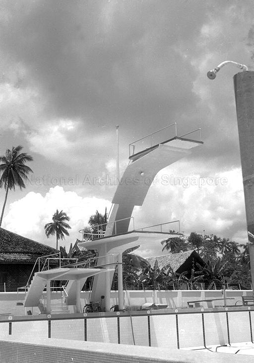 [SINGAPORE'S NEWEST SWIMMING POOL WILL BE OFFICIALLY OPEN BY THE GOVERNOR OF SINGAPORE, SIR FRANKLIN GIMSON, NEXT SATURDAY. BUILT AT A COST OF $500,000 BY THE CHINESE SWIMMING CLUB, IT FILLS A LONG FELT NEED AND SOLVES THE CLUB PROBLEM OF EVER-INCREASING MEMBERSHIP NOW NEARING 8000.] THE THREE TIER DIVING STAGE AT THE CHINESE SWIMMING CLUB'S NEW $500,000 POOL. THE DIMENSION ARE ACCORDING TO OLYMPIC REQUIREMENTS.