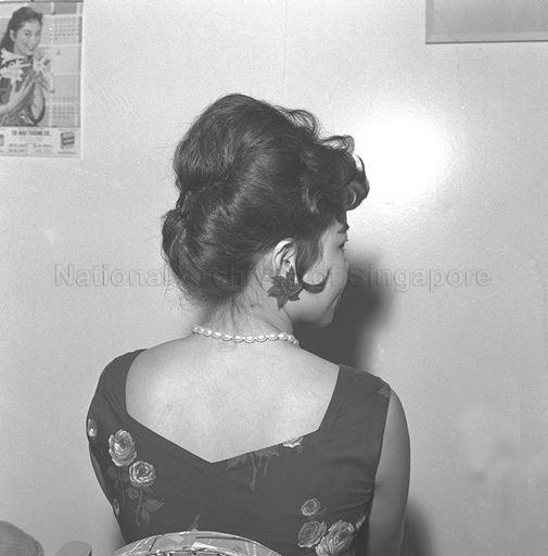 [JENNIE LIM] [CUTE HAIR STYLE WITH A TOP KNOT FORMED OF YOUR OWN HAIR OR WITH THE AID OF AN ARTIFICIAL CHIGNON. THE STYLE WAS CREATED BY JENNIE LIM OF STELLA HAIR-DRESSING SALON, JUST OPENED AT 42, PRINSEP STREET.] EXTRACT FR TEXT: [ADAPTED FROM THE HAIR-STYLE OF AN ANCIENT JAPANESE PRINCESS, THE HAIR IS CAUGHT UP ARONUD THE CROWN AND THE TOP IS FORMED INTO A BUN. IN THE CENTRE, JUST BEHIND THE HEAD YOU CAN EITHER WEAR A SPARKING CLIP OR A COLOURED SLIDE TO MATCH YOUR DRESS.]