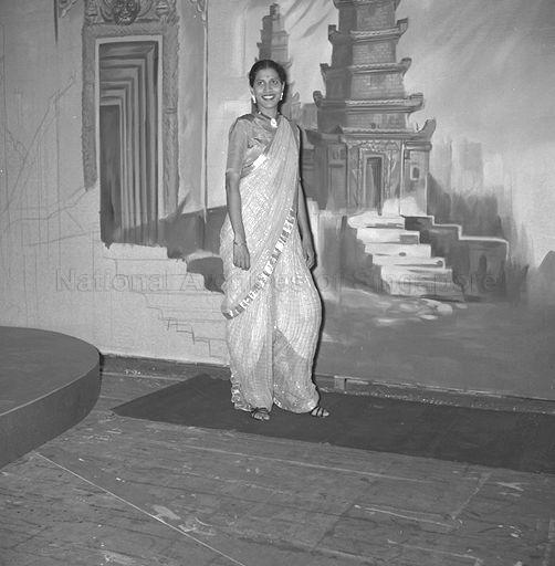 [LEELA PADBIDRI] [THE BEAUTIFUL ANCIENT HINDU SARI WORN BY MRS LEELA PADBIDRI, IS ONE OF THE WONDERFUL COSTUMES TO BE SEEN IN "MORE ABOUT EVE", WHICH WILL BE PRESENTED AT RAFFLES HOTEL ON DECEMBER 1, 3, 5 AND 8, TO AID THE SINGAPORE YOUTH SPORTS CENTRE. THIS COSTUME, LOANED BY MRS TAJ NAMAZIE, IS THE EARLY HINDU COSTUME OF THE MALABAR COAST. IT HAS A SHORT TIGHT CHOLI AND NINE YARDS OF CREAM AND PURE GOLD MATERIAL IN THE SARI.] THE BEAUTIFUL ANCIENT HINDU SARI WORN BY MRS LEELA PADBIDRI.