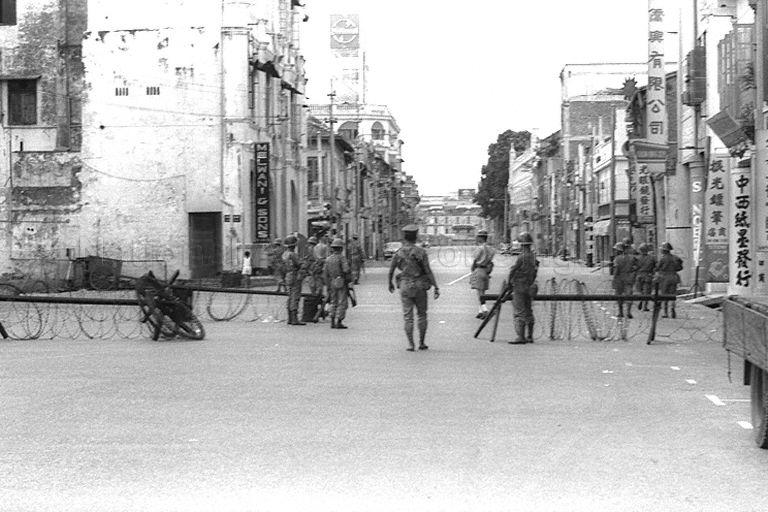 ROAD BLOCK SET UP BY POLICE AND SOLDIERS IN NORTH BRIDGE ROAD AREA AFTER A RACIAL RIOT