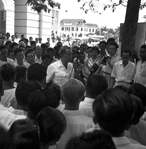 CHIEF MINISTER DAVID MARSHALL SPEAKING TO CROWD OF SUPPORTERS AT EMPRESS PLACE
