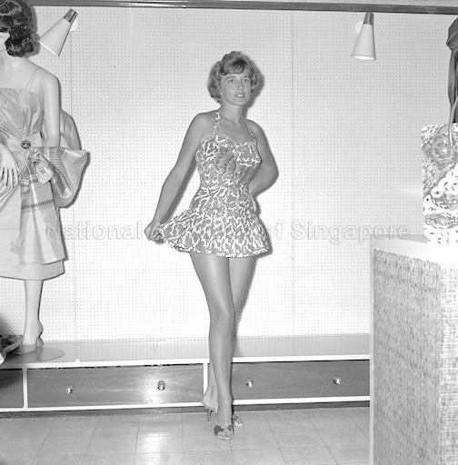 [FASHION SHOW AT ANTOINETTE, ORCHARD ROAD. PARIS MAY DECREE THAT WE WEAR THE LITTLE BOY-LOOK THIS YEAR, BUT AS FAR AS THE LOCAL FASHION SCENE IS CONCERNED, THE MATERIAL IS BATIK. A SHOP IN ORCHARD HAS JUST BROUGHT OUT A COLLECTION OF THE LATEST CREATIONS IN BATIK - SWIMSUITS, DRESSES, DUSTER COARTS, BEACH JACKETS, AS WELL AS SPORTS WEARS.] MAUREEN WEARS TWO SWIMSUITS WITH THE LITTLE-BOY-LOOK.