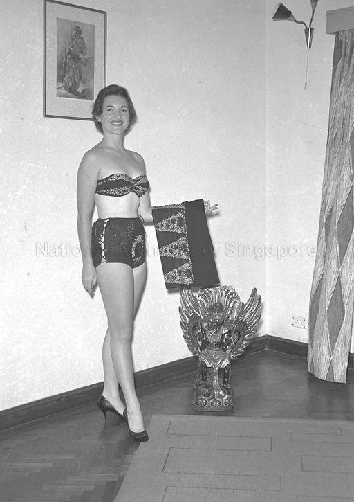 [MODEL ANN REED IN BATIK BATHING SUIT AT NEE ANN BUILDING, SINGAPORE. SHE WEARS A BATIK 2 PIECE SUIT WHICH HAS A MATCHING JACKET.] BATIK FOR THE BEACH. PRETTY MODEL ANN REED WORE THIS ATTRACTIVE BATIK OUTFIT AT A MANNEQUIN PARADE YESTERDAY ARRANGED BY THE BRITISH EUROPEAN ASSOCIATION. THE BATHING-SUIT IS TOPPED BY A SHORT MATCHING JACKET. DESIGNED BY MARY MACAREE.