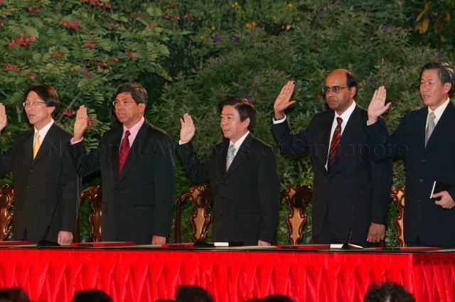 SWEARING-IN CEREMONY OF PRIME MINISTER LEE HSIEN LOONG AND THE NEW CABINET AT THE ISTANA - PICTURE SHOWS CABINET MINISTERS (FROM RIGHT) DR NG ENG HEN, THARMAN SHANMUGARATNAM, KHAW BOON WAN, ASSOCIATE PROFESSOR YAACOB IBRAHIM AND LIM SWEE SAY TAKING OATH OF ALLEGIANCE