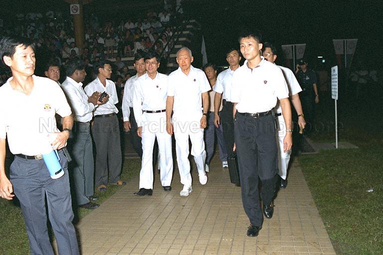 MEMBER OF PEOPLE'S ACTION PARTY (PAP) LEE KUAN YEW ARRIVING FOR THE PAP 1996 GENERAL ELECTIONS RALLY FOR CHENG SAN GROUP REPRESENTATION CONSTITUENCIES AT HOUGANG STADIUM, HOUGANG AVENUE 2