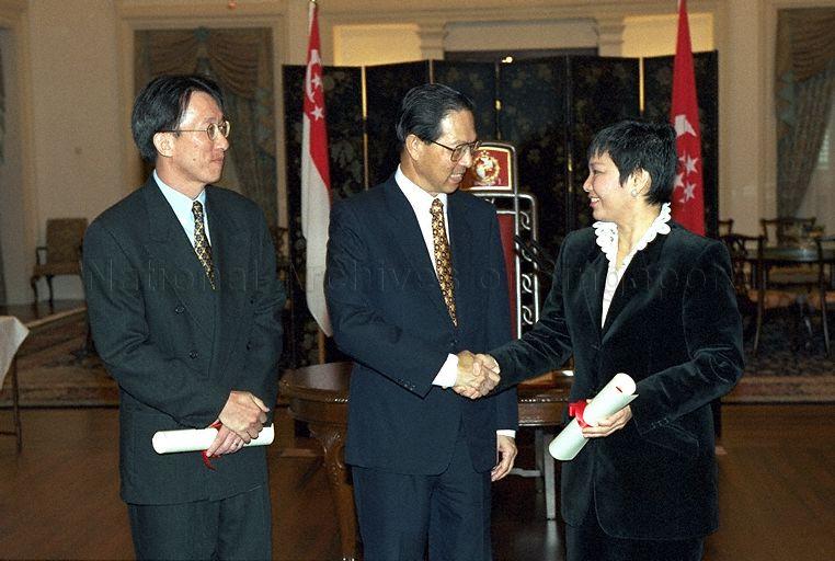 PRESIDENT ONG TENG CHEONG WITH MINISTER OF STATE LIM SWEE SAY AND SENIOR PARLIAMENTARY SECRETARY MRS YU FOO YEE SHOON AFTER THE SWEARING-IN-CEREMONY AT THE EAST DRAWING ROOM, ISTANA