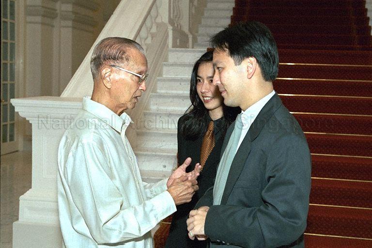 FORMER PRESIDENT WEE KIM WEE (LEFT) WITH PRESIDENT ONG TENG CHEONG'S SECOND SON, TZE BOON AND HIS WIFE, WANG YIYI DURING A LUNCH HOSTED BY PRESIDENT ONG FOR FORMER PRESIDENT DR WEE AND PRESIDENT-ELECT S R NATHAN AT THE PRESIDENT'S LOUNGE, ISTANA